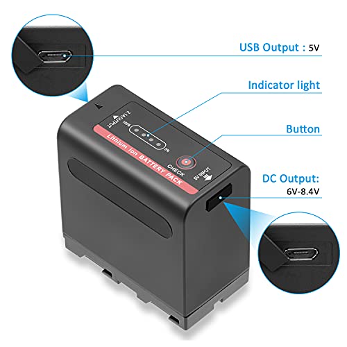 Multifunktions NP-F970 Kamera-Akku: (1)Laden Sie sich mit Micro Anschlüssen direkt ohne f970 akku ladegerät. Aufgeladen über ein Ladegerät, ein Autoladegerät oder einen Laptop. (2)Power bank funktion. Mit 5V USB-Ausgang Hafen können alle Smartphones aufgeladen werden.