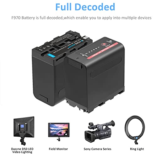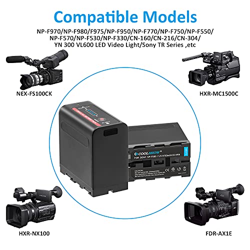 Specification: COOLSHOW NP-F970 Akku 7,4V 8700mAh NP-F960 NP-F980 NP-F930 NP-F950 Ersatzakku 2 Stück mit 5V USB Ausgang und Micro USB Eingang Kompatibel für Sony DCR-VX2100,PD150,PD170,FDR-AX1,HDR-AX2000,FX1,FX1000