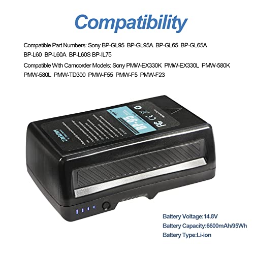 Specification: GDORUN 95Wh 6600mAh BP-95 V-Mount V-Lock Kamera Akku für Sony Camcorder Videokamera BMCC ARRI Canon EOS Aja Cion Blackmagic URSA Cine Alta USB Ausgang D-Tap LED Panel BP-L60A BP-800S
