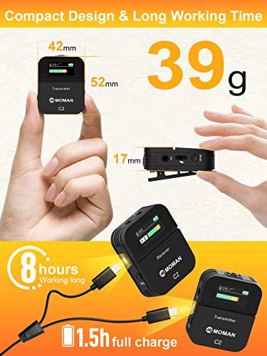 【70 m LOS Zuverlässige Aufnahme】 Basierend auf einem 2,4-GHz-Spektrum bietet das drahtlose Lavalier-Mikrofonsystem MOMAN C2 eine lange Audioübertragung von bis zu 150 m, störungsfrei und regulierungsfrei, einfach zu bedienen für Filmen, Interviews, Vlogging und mehr.