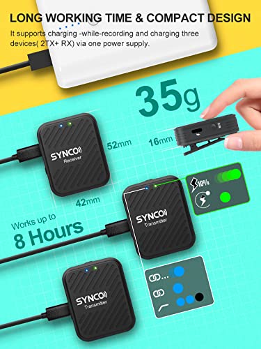 【Lange Arbeitszeit und kompakte Größe】Mit einer eingebauten 400-mAh-Lithiumbatterie arbeitet G1(A2) bis zu 8 Stunden nach vollständiger Aufladung. Es unterstützt das Laden während der Aufnahme und das Laden von drei Geräten(2 Transmitter und Empfänger) über ein Netzteil. Das G1(A2)-System wiegt jeweils nur 35 g und ist 52 x 42 x 16 mm groß. Es unterstützt flexibel das eingebaute und externe Mikrofon.